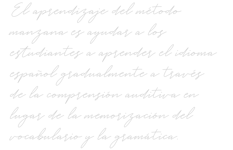 At Manzana, we focus our method of teaching on the second language acquisition theories of linguistics expert Stephen Krashen. The emphasis of the Manzana method is to help students gradually learn the Spanish language through listening comprehension rather than memorization of vocabulary and grammar.